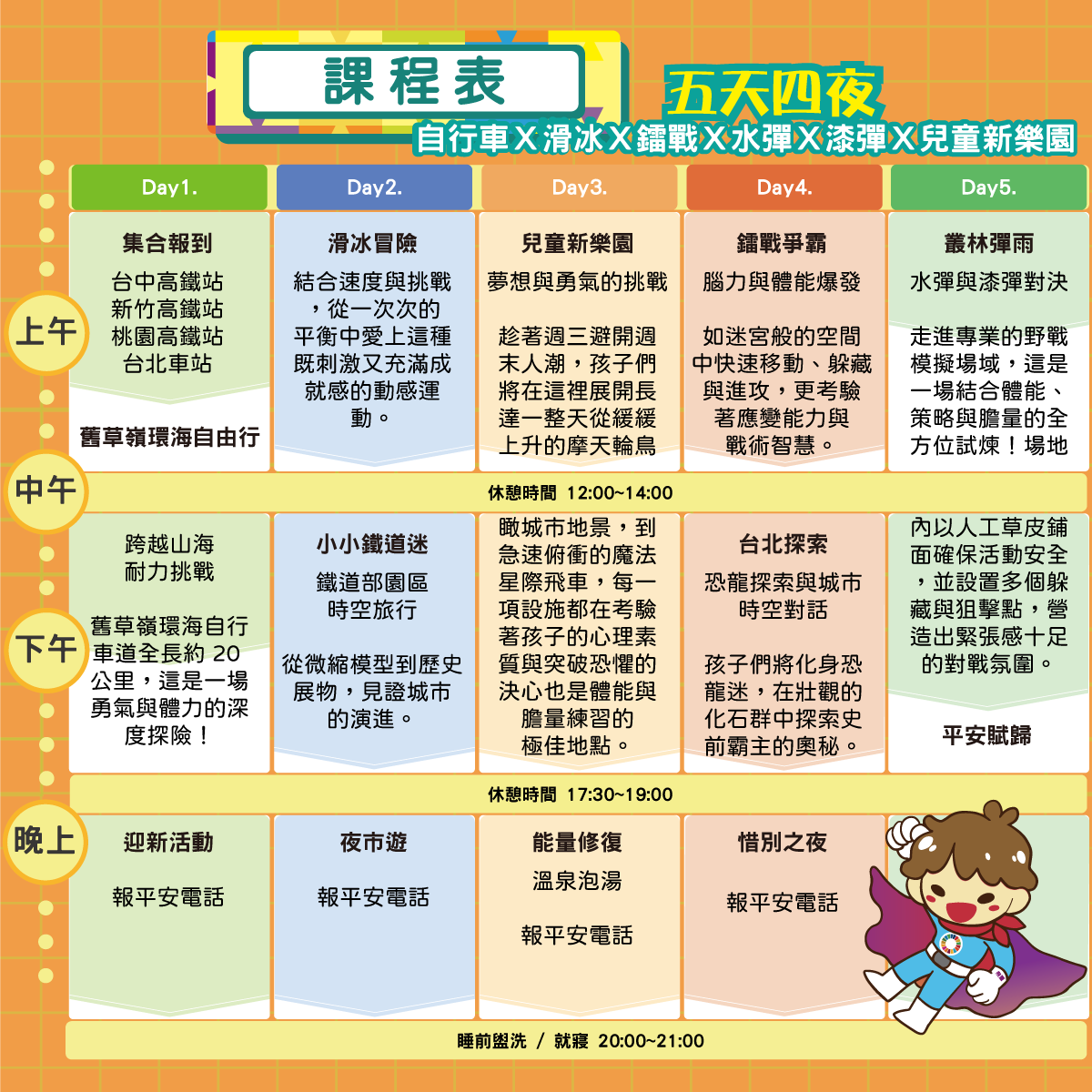 想讓孩子在五天內體驗各種極限挑戰,培養獨立思考與團隊合作能力嗎?結合戶外運動、城市探索與生態體驗,讓孩子親身感受速度、力量與策略的樂趣,突破自我,成為真正的探索高手!
